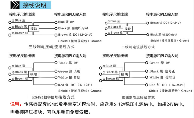 米兰特外置式变送模块可接任意一款电子尺或者微型拉绳尺,输出0-3.3V、0-5V、0-10V电压信号,4-20mA电流信号或者RS485数字信号